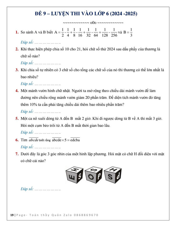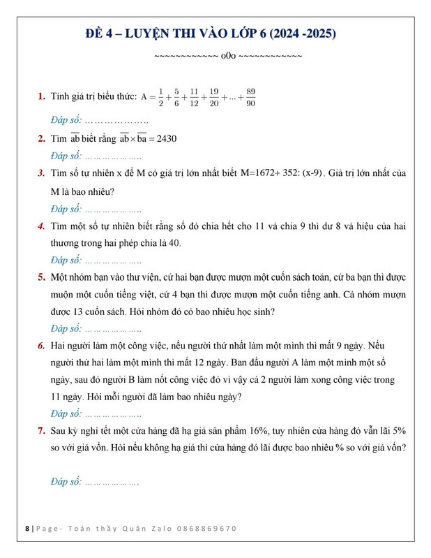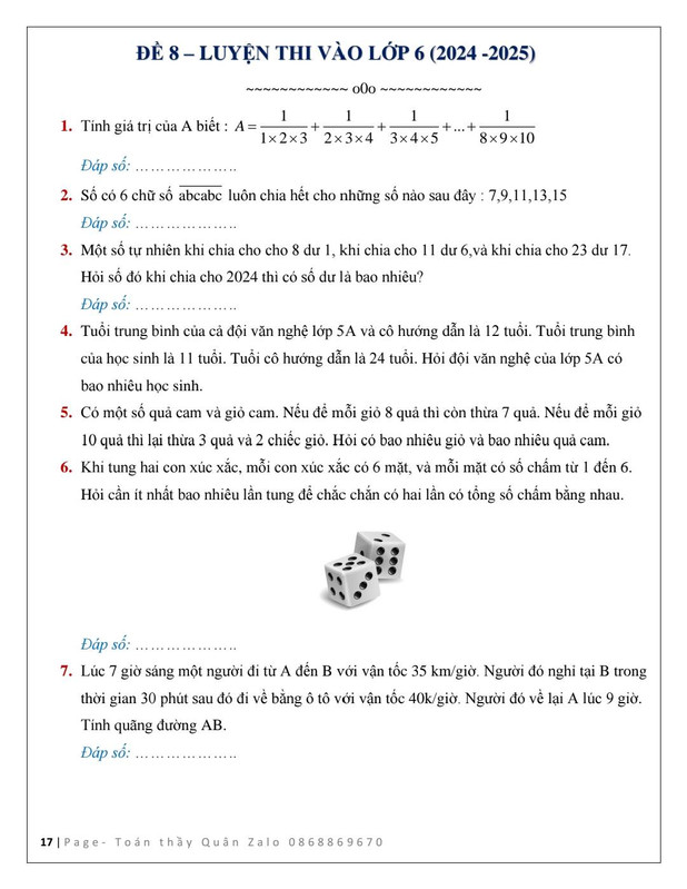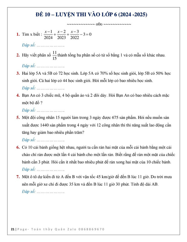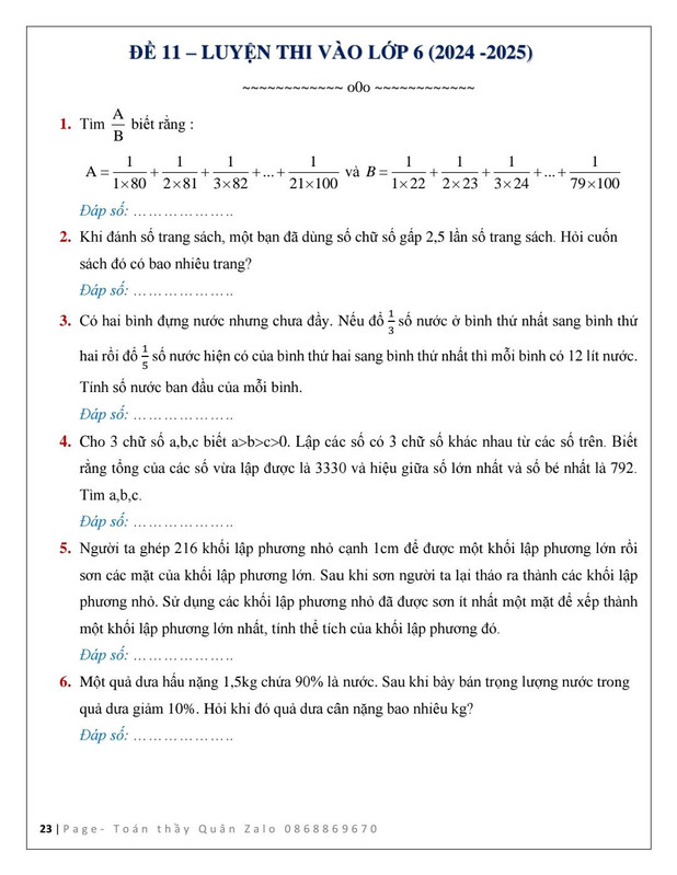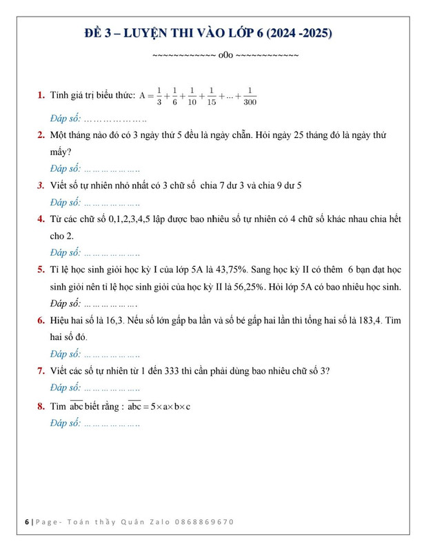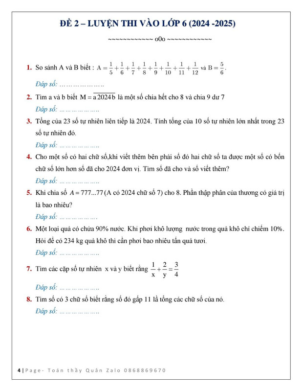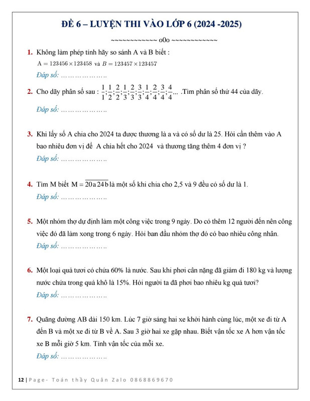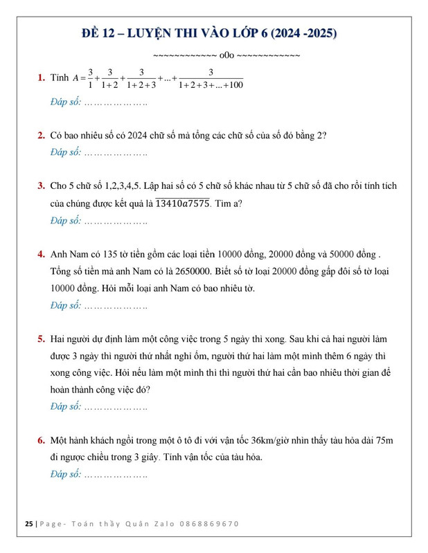 12 Đề luyện thi vào lớp 6 năm 2024 - 2025