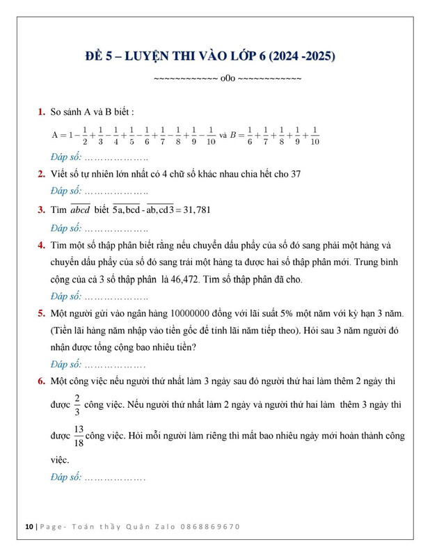 Các em học sinh lớp 5 luyện thi vào lớp 6 các trường chất lượng cao tham khảo bộ 12 đề luyện thi năm 2024-2025. Bộ đề này không có đáp án, nguồn đề như trên ảnh. Chúc các em ôn luyện và thi tốt !