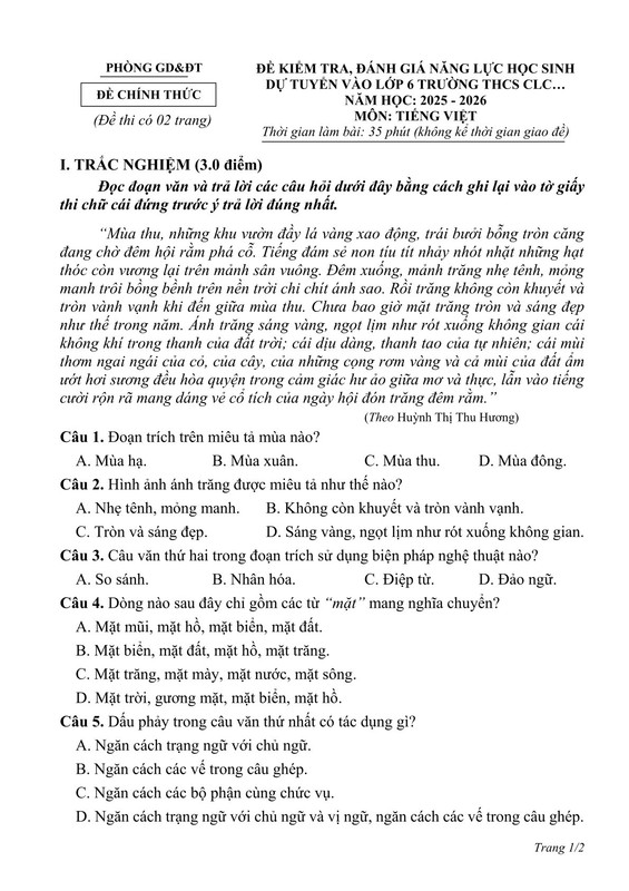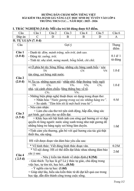 ĐÁP ÁN ĐỀ THI MÔN TIẾNG VIỆT
